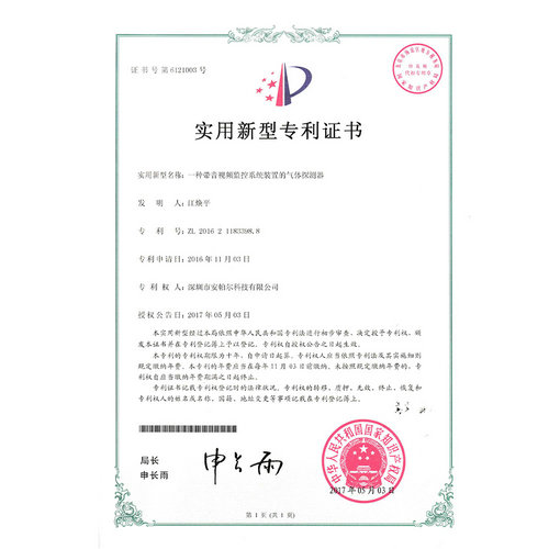 一種帶音視頻監控系統裝置的氣體探測器專利證書