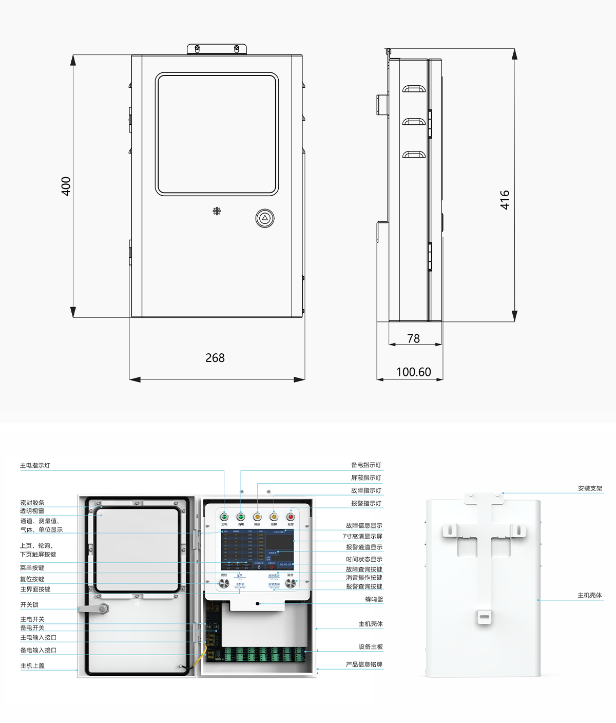 總體尺寸:高*寬*厚=約416mm*268mm*101mm(不含安裝支架);進(jìn)出線孔尺寸:直徑30mm; |